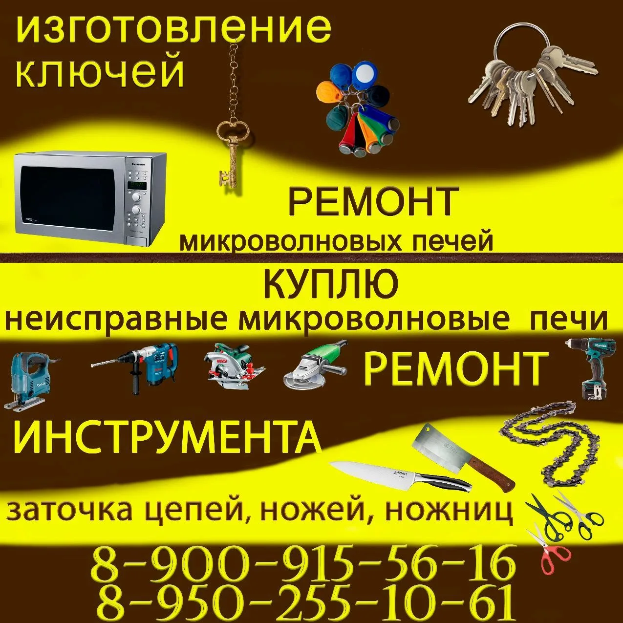 Арктическая 6 отдел Ключи 89502551061 89009155616 Мастерская по ремонту : Электроинструмента Микроволновых печей и другой мелкой бытовой техники Заточка цепей Изготовление ключей Покос травы
