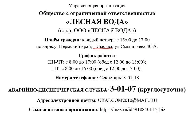 Управляющая компания ООО "Лесная вода". Телефон аварийно-диспетчерской службы: 3-01-07 Полная информация на фото в аватарке и закреплённом сообщении