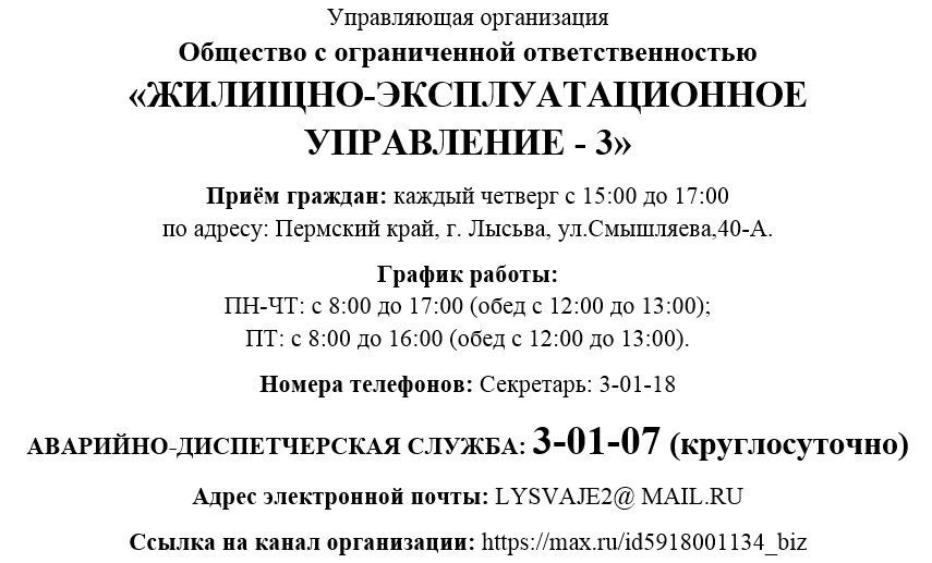 Управляющая компания ООО "Жилищно-эксплуатационное управление - 3". Телефон аварийно-диспетчерской службы: 3-01-07 Полная информация на фото в аватарке и закреплённом сообщении