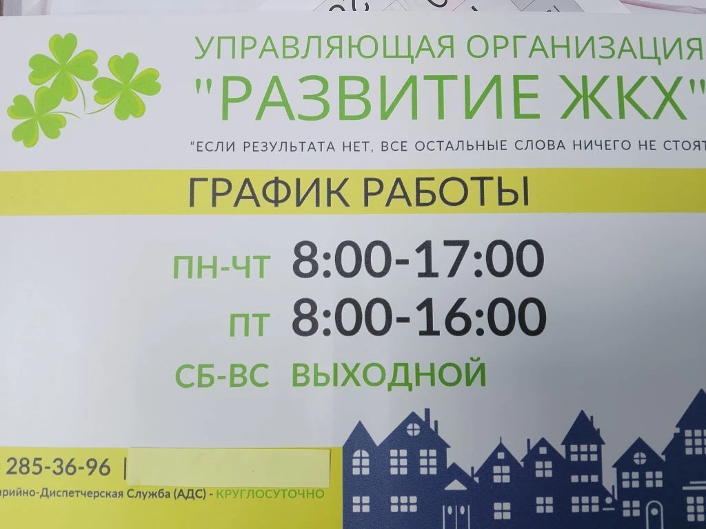 Эл.почта uo_razvitie@mail.ru пр. Королева 29В Телефон офиса 285-36-96 АДС 308-88-15. АДС 303-20-03 - Белева 22 Аварийная по лифтам - 236-57-16. График работы Пн-Чт с 8 до 17 Пт с 9-16 выходной сб-вс